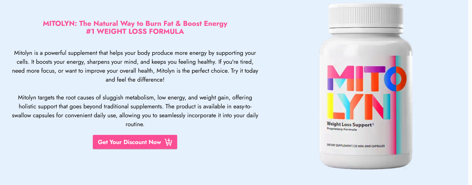 Say goodbye to fad diets and false promises — and say hello to a healthier, happier, and more energetic version of yourself with Mitolyn – Weight Loss Support Formula.