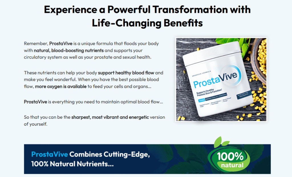 ProstaVive is a powerful natural supplement crafted to support a healthy prostate and urinary function. It’s designed to help reduce those pesky nighttime trips to the bathroom and enhance bladder control. With a blend of potent ingredients like Saw Palmetto and Lycopene, it aims to boost male vitality and overall comfort. This formula works to maintain hormonal balance and elevate men’s wellness. By incorporating ProstaVive into your daily routine, you can regain your confidence, energy, and support a healthy prostate naturally.